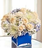 EXCLUSIVE The color blue symbolizes peace, calm and serenity. It’s also the color of protection, faith and understanding. Send your message of caring and comfort during times of loss with this arrangement of blue hydrangea, white roses, carnations, spider mums and poms, hand-designed in a modern cube vase lined with a bright blue foam ribbon. Hand-designed arrangement of blue hydrangea and white roses, carnations, spider mums and button poms Arrives in a stylish clear glass cube vase wrapped with a blue foam ribbon; vase measures 5″H x 5″D An appropriate sympathy expression for the homes of friends or family members Large arrangement measures approximately 11.5″H x 12″L Medium arrangement measures approximately 11″H x 11.5″L Small arrangement measures approximately 10.5″H x 11″L Our florists select the freshest flowers available so floral varieties may vary